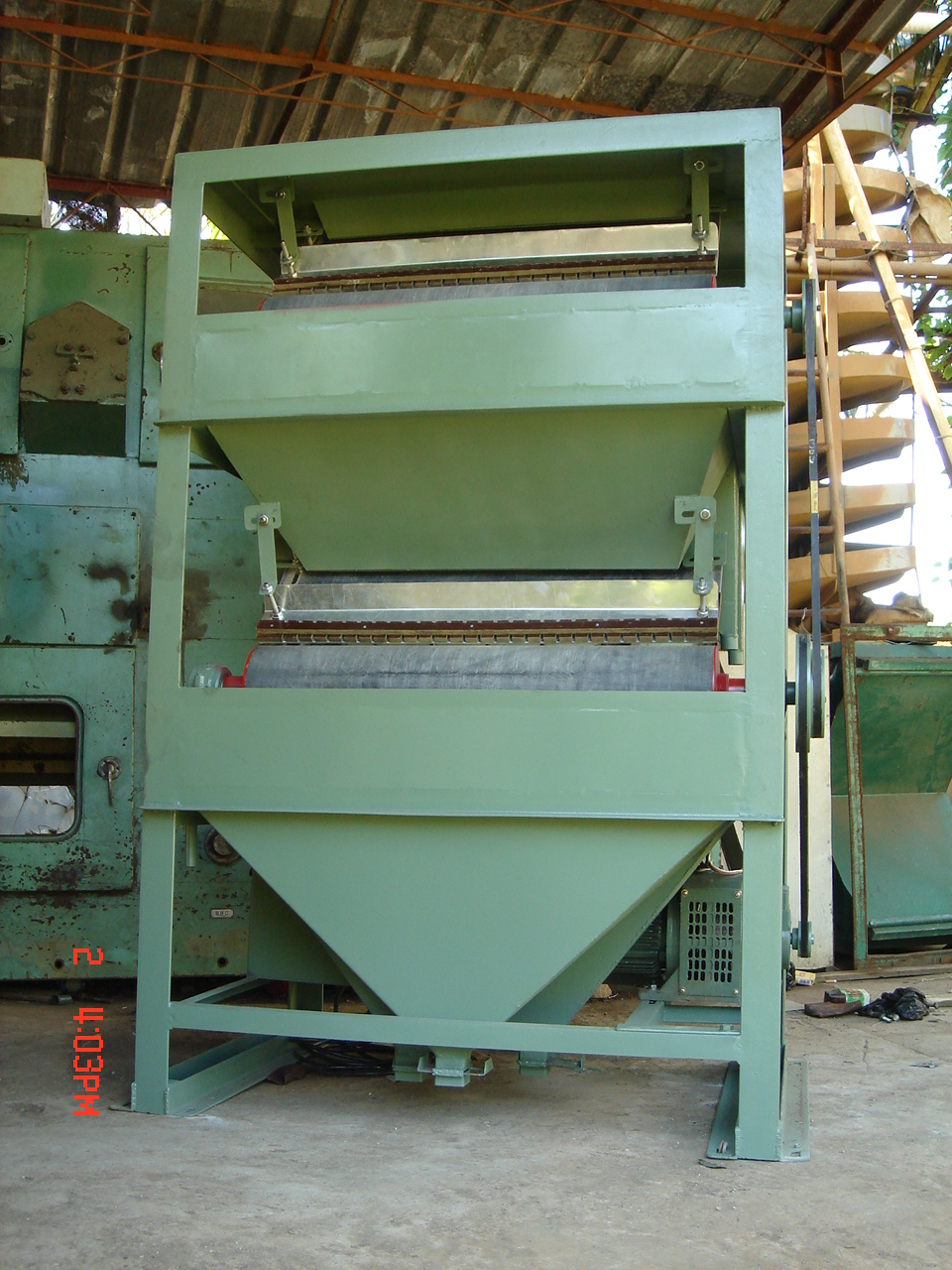 机器由机架、稀土磁滚筒、料斗、给料装置、传动皮带、不导磁接料装置、无级调速电机等部件组成。